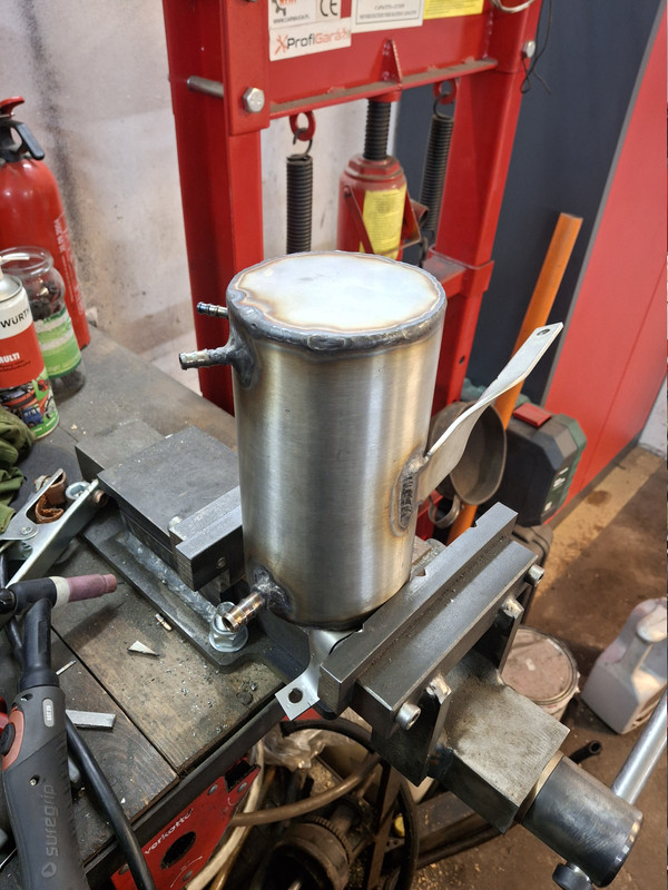 Uspawałem sobie wreszcie swirl pot/surge tank, mam nadzieję, że rozwiąże problem braku paliwa na szybkich łukach.